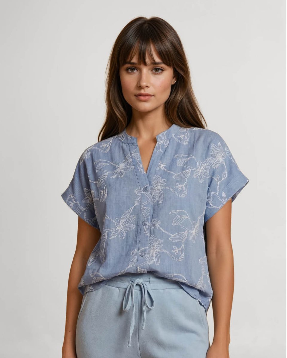 De Katie blouse in licht-blauw met bloemen puff dessin is een trendy boxy model met een losvallende pasvorm. e blouse is uitgevoerd met korte mouwen, een opstaande kraag met V-hals en een knoopsluiting. Het doorknoop model met puff broderie zorgt voor een subtiel reliëf in de stof.